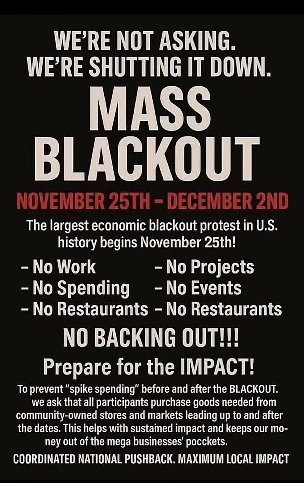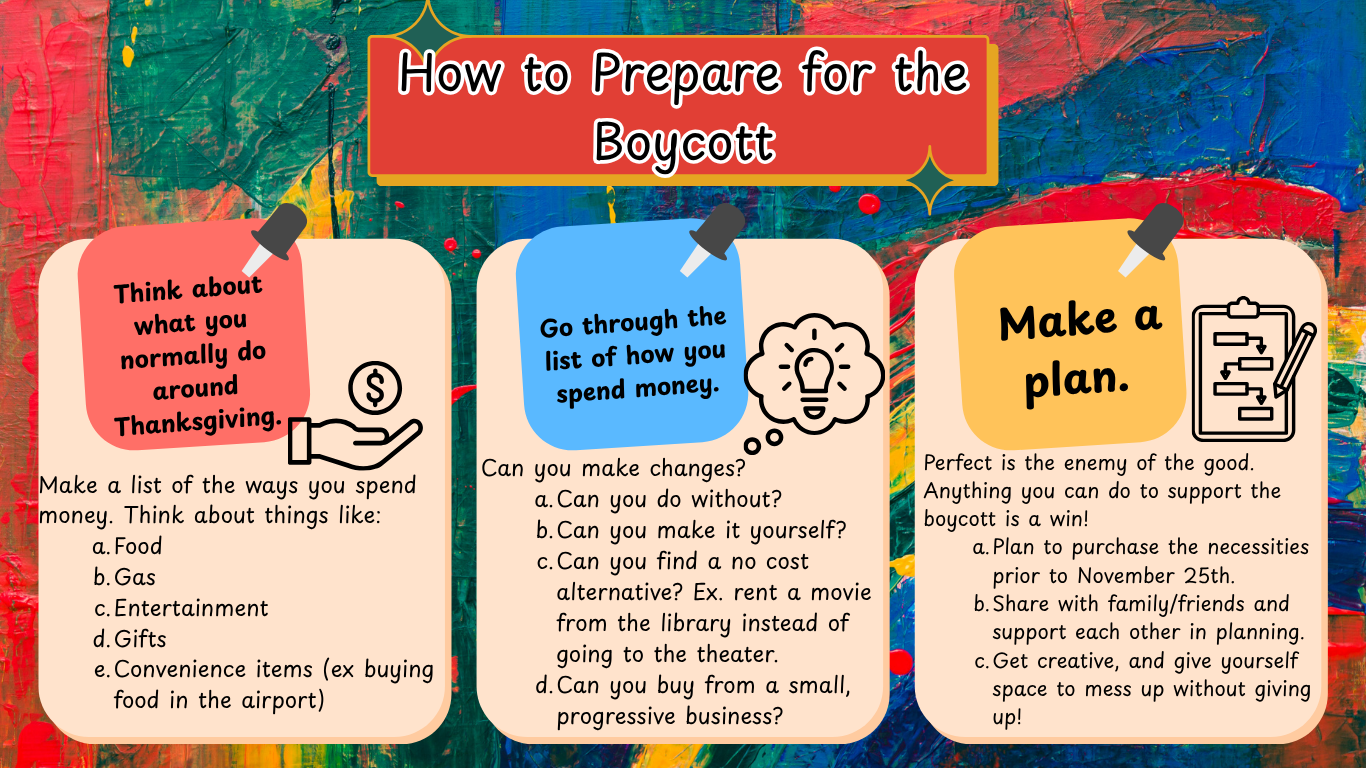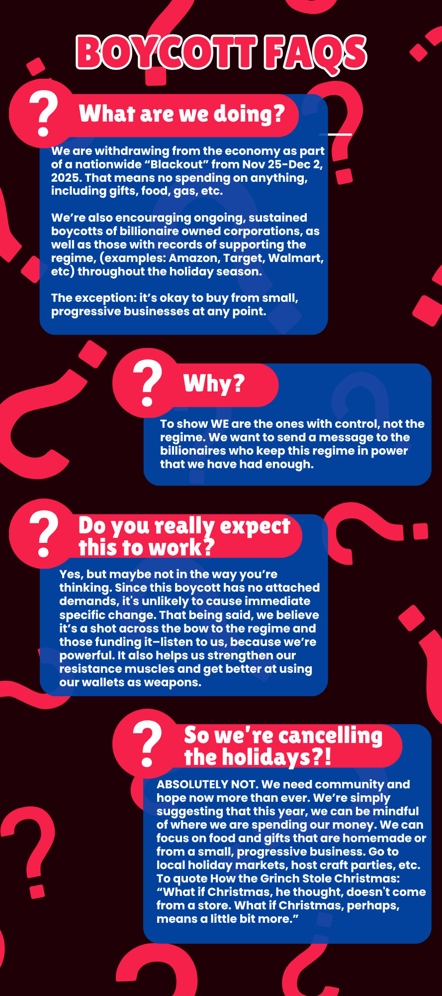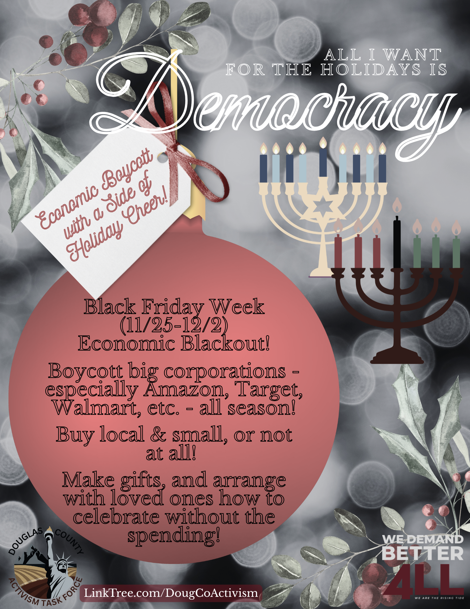 We've put together this resource page to help you prepare for and successfully participate in the national Economic Blackout week from November 25th - December 2nd, as well as mindful boycott of big corporations through this holiday season.